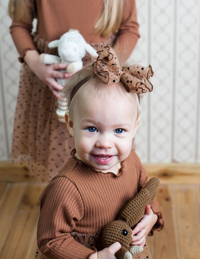 Особливість моделі: Трикотажна пов'язка з великим бантом, розшитим вручну перлинними бусинами.