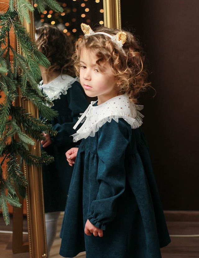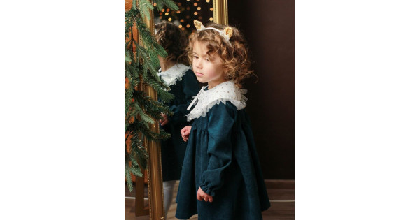 Особливість моделі: велюрова сукня з пишною спідницею, об'ємними рукавами зі сборочками і фігурним вирізом горловини. Ззаду плаття застібається на блискавку, всередині на бавовняній підкладці.