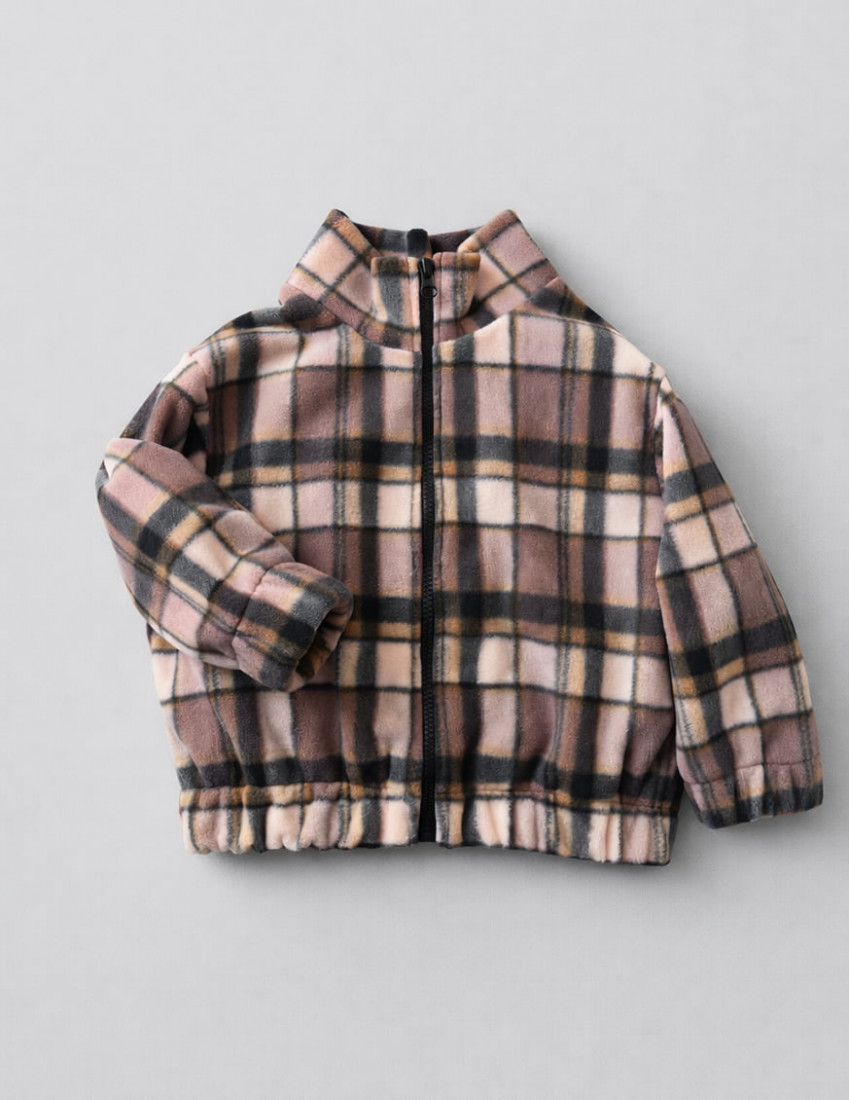 Особливість моделі: легка флісова куртка у клітинку з довгим рукавом, комірцем та застібкою на блискавці.