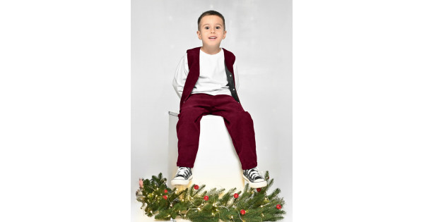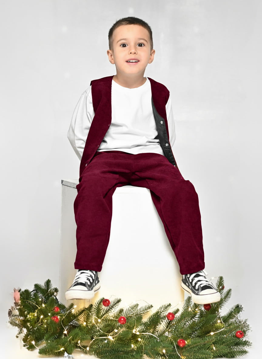 Особливості моделі: Вельветовий костюм, складається з двох речей - штани та жилет. Штани прямого крою із поясом на резинці, спереду є дві кишені. Жилет спереду застібається на кнопки.