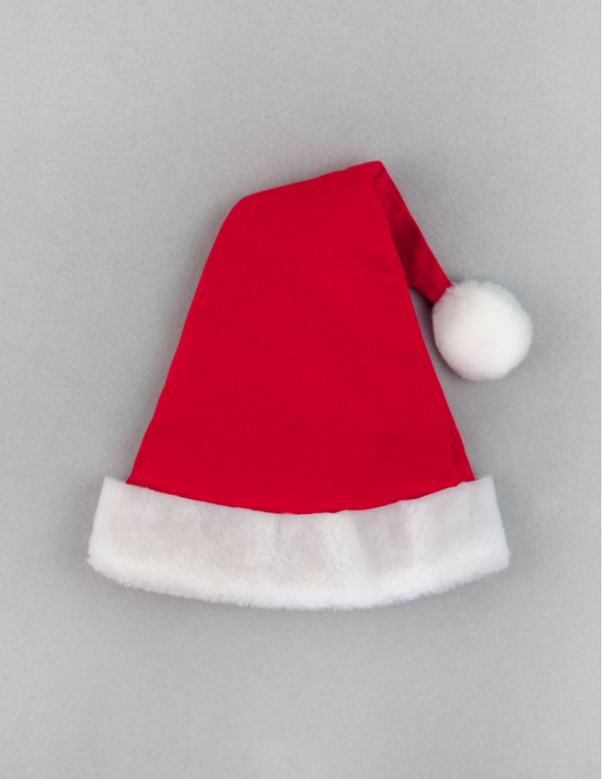 Матеріал шапки Санта: трикотажне полотно подвійного плетіння; облямівка - текстильний матеріал, що імітує натуральне хутро